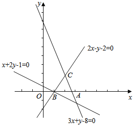 解:作出不等式组$\left\{\begin{array}{l}{3x+y-8≤0}\\{x+2y-1≥0}\\{2x-y-2≥0}\end{array}\right.$所对应的可行域(如图△ABC),