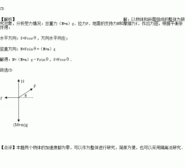 如图所示,质量为m的物体在与斜面平行向上的拉力F作用下,沿着水平地面上质量为M的粗糙斜面匀速上滑,在此过程中斜面保持静止,则地面对斜面( )
