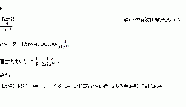 如图所示,平行导轨间距为d,一端跨接一个阻值为R的电阻,匀强磁场的磁感应强度为B,方向与导轨所在平面垂直.一根足够长的金属棒与导轨成θ角放置,金属棒与导轨的电阻不计.当金属棒沿垂直于棒的方向以速度v滑行时,通过电阻R的电流强度是( )