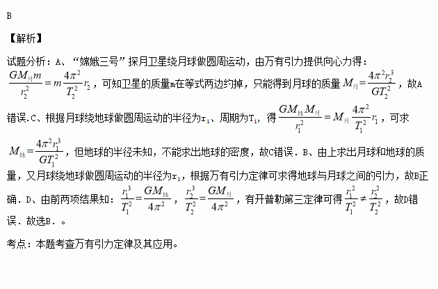 “嫦娥三号”探月卫星于2013年12月2日1点30分在西昌卫星发射中心发射,将实现“落月”的新阶段。若已知引力常量G,月球绕地球做圆周运动的半径r1、周期T1,“嫦娥三号”探月卫星绕月球做圆周运动的环月轨道(见图)半径r2、周期T2,不计其他天体的影响,则根据题目条件可以( )