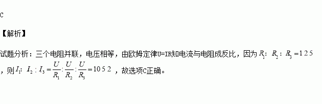 三个电阻之比为R1:R2:R3=1:2:5,将这三个电阻并联,则通过这三支路的电流强度I1:I2:I3之比为( )