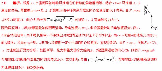 如图所示,“旋转秋千”中的两个座椅A、B质量相等,通过相同长度的缆绳悬挂在旋转圆盘上。不考虑空气阻力的影响,当旋转圆盘绕竖直的中心轴匀速转动时,下列说法正确的是