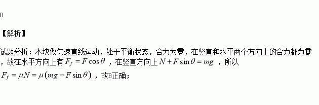 如图所示,质量为m的木块置于水平地面上,木块在与水平方向成θ角的拉力F作用下沿地面做匀速直线运动,木块与地面间的动摩擦因数为μ,则木块所受地面给它的滑动摩擦力大小是: