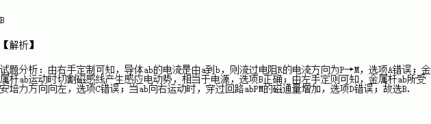 如图所示,水平放置的金属导轨MN、PQ处于竖直向下的匀强磁场中,导轨左端M、P连接电阻R,金属杆ab在水平力F的作用下沿导轨自静止开始向右运动,并与导轨接触良好。下列判断正确的是