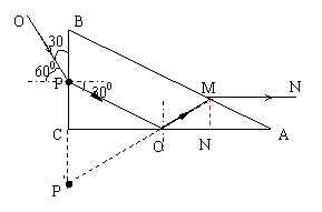 如图所示,ABC为直角三棱镜,BC边长为16 cm,AB边长为32 cm.有一束很强的细光束OP射到BC边上,入射点P为BC的中点,OP与BC的夹角为30°,该光束从P点进入棱镜后再经AC面反射沿与AC平行的MN方向射出,其中M为AC边上的一点,AM=8cm.则棱镜的折射率是多少?