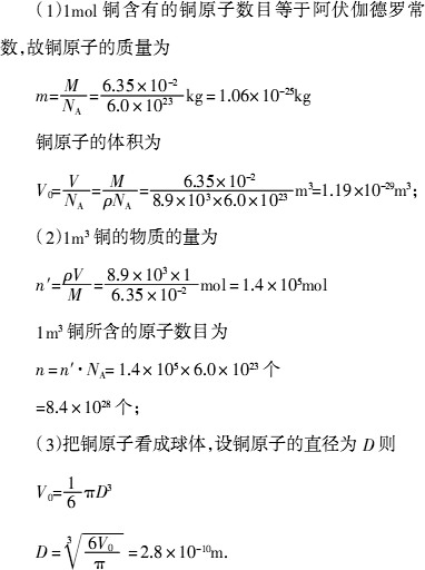 6.35×10-2 kg/mol,密度为8.9×103 kg/m3,阿伏伽德罗常数为6.0×1023 mol-1,求:(1)铜原子的质量和体积;