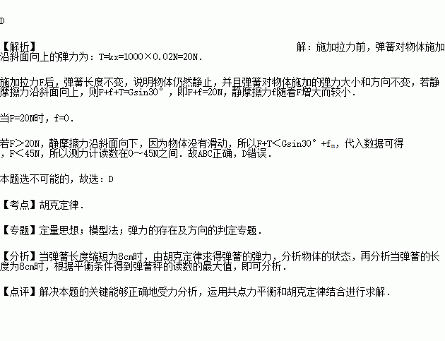 如图所示,重80N的物体A放置在倾角为30°的粗糙斜面上,有一根原长为10cm,劲度系数为1000N/m的弹簧,其一端固定在斜面上底端,另一端放置物体A后,弹簧长缩短为8cm,现用一弹簧秤沿斜面上拉物体,若滑块与斜面间最大静摩擦力为25N,当弹簧的长度仍为8cm时,弹簧秤的读数不可能为( )