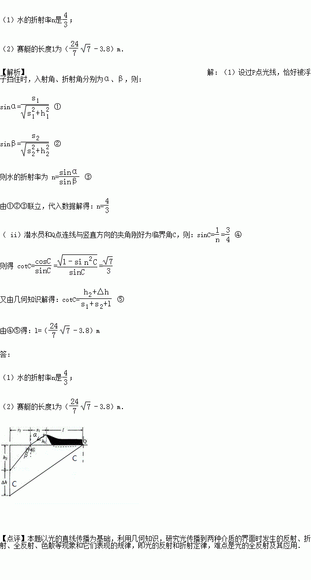Ò»ÈüͧͣÔÚÆ½¾²µÄË®ÃæÉÏ£¬Èüͧǰ¶ËÓÐÒ»±ê¼ÇPÀëË®ÃæµÄ¸ß¶ÈΪh1=0.6m£¬Î²²¿Ï¶ËQÂÔ¸ßÓÚË®Ãæ£¬ÈüͧÕýǰ·½ÀëÈüͧǰ¶Ës1=0.8m´¦ÓÐÒ»¸¡±ê£¬Ê¾ÒâÈçͼ£®Ò»Ç±Ë®Ô±ÔÚ¸¡±êǰ·½s2=3.0m´¦ÏÂDZµ½Éî¶ÈΪh2=4.0mʱ£¬¿´µ½±ê¼Ç¸ÕºÃ±»¸¡±êµ²×¡£¬´Ë´¦¿´²»µ½´¬Î²¶ËQ£¬¼ÌÐøÏÂDZ¡÷h=4.0m£¬Ç¡ºÃÄÜ¿´¼ûQ£®Çó£º