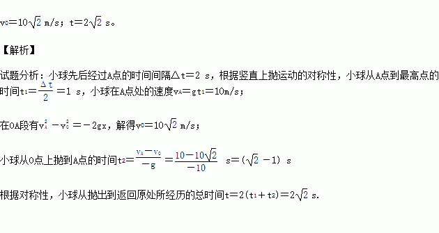 一小球竖直向上抛出,先后经过抛出点的上方h=5 m处的时间间隔Δt=2 s,则小球的初速度v0为多少?小球从抛出到返回原处所经历的时间是多少?(取g=10 m/s2)