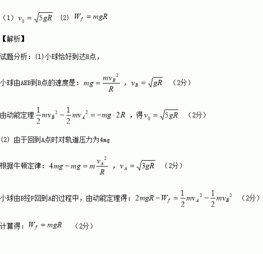 有一个固定竖直放置的圆形轨道,半径为R,由左右两部分组成。如下图所示,右半部分AEB是光滑的,左半部分BFA是粗糙的。现在最低点A给一质量为m的小球一个水平向右的初速度,使小球沿轨道恰好运动到最高点B,小球在B点又能沿BFA回到A点,到达A点时对轨道的压力为4mg。求: