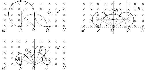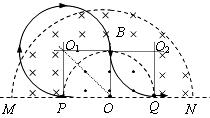 如图所示,直线MN下方无磁场,上方空间存在两个匀强磁场,其分界线是半径为R的半圆,两侧的磁场方向相反且垂直于纸面,磁感应强度大小都为B.现有一质量为m、电荷量为q的带负电微粒从P点沿半径方向向左侧射出,最终打到Q点,不计微粒的重力.求: