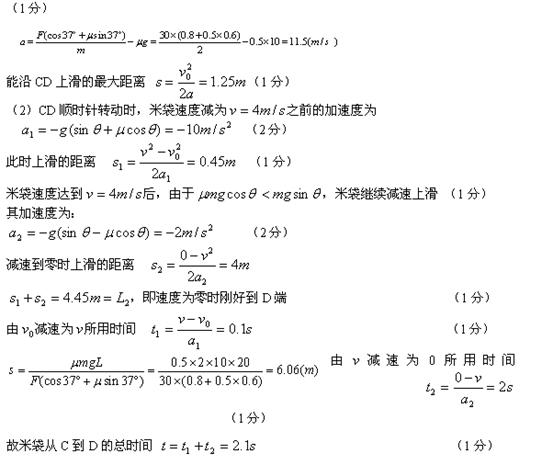(1)若倾斜传送带CD不转动,则米袋沿传送带CD所能上滑的最大距离是多少?