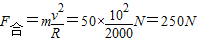 如图所示,有些地区的铁路由于弯多、弯急,路况复杂,依靠现有车型提速的难度较大,铁路部门通过引进摆式列车来解决转弯半径过小造成的离心问题,摆式列车是集电脑、自动控制等高新技术于一体的新型高速列车。当列车转弯时,在电脑控制下,车厢会自动倾斜,使得车厢受到的弹力FN与车厢底板垂直,FN与车厢重力的合力恰好等于向心力,车厢没有离心侧翻的趋势(车轮内缘还要受到外轨侧向的弹力),当列车行走在直线上时,车厢又恢复原状,就像玩具“不倒翁”一样。它的优点是能够在现有线路上运行,无需对线路等设施进行较大的改造。运行实践表明:摆式列车通过弯道的速度可提高20%---40%,最高可达50%,摆式列车不愧为“曲线冲刺能手”。假设有一超高速摆式列车在水平面内行驶,以360Km/h的速度转弯,转弯半径为2 Km,则质量为50Kg 的乘客在拐弯过程中所受到的火车给他的作用力约为( )