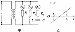 图甲所示电路中,A1、A2、A3为相同的电流表,C为电容器,电阻R1、R2、R3的阻值相同,线圈L的电阻不计.在某段时间内理想变压器原线圈内磁场的变化如图乙所示,则在t1~t2时间内( )