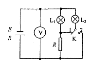 如图所示的电路中,电电动势为E,内阻为R,L1和L2为相同的灯泡,每个灯泡(阻值恒定不变)的电阻和定值电阻相同,阻值均为R,电压表为理想电表,K为单刀双掷开关,当开关由1位置打到2位置时,下列说法错误的是:( )