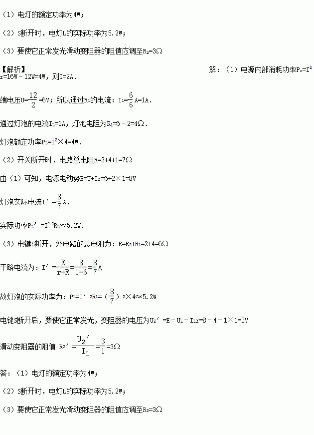 图中电阻R1=6Ω,滑动变阻器R2的最大阻值为10Ω,开始调至2Ω,电源电阻r=1Ω.当S闭合时,电源的总功率为16W,电源输出功率为12W.这时灯L正常发光.试求: