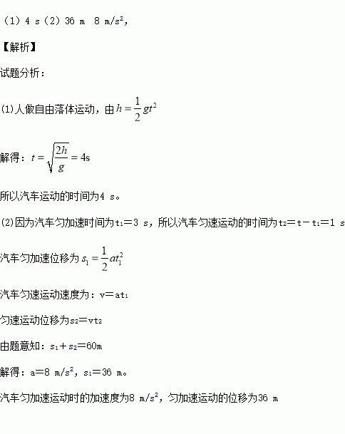 £¨10·Ö£©Ä³µçÊÓ¾çÖÆ×÷ÖÐÐÄÒªÅÄÉãÒ»ÌØ¼¼¶¯×÷£¬ÒªÇóÌØ¼¼ÑÝÔ±´Ó80 mµÄ´ó¥¥¶¥×ÔÓÉÏÂÂäµ½ÐÐÊ»µÄÆû³µÉÏ£¬ÈôÑÝÔ±¿ªÊ¼ÏÂÂäµÄͬʱÆû³µÔÚµØÃæÉÏ´Ó¾àÂ¥µ×60 mÔ¶´¦Óɾ²Ö¹ÏòÂ¥µ×ÏÈÔȼÓËÙÔ˶¯3 s£¬ÔÙÔÈËÙÐÐÊ»µ½Â¥µ×£¬Îª±£Ö¤ÑÝÔ±Äܰ²È«Âäµ½Æû³µÉÏ(²»¼Æ¿ÕÆø×èÁ¦£¬ÈËºÍÆû³µ¿´³ÉÖʵ㣬 g£½10 m/s2)£¬Çó£º