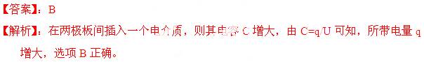 (2013江苏省苏锡常镇四市调研)与直流电源相连的平行板电容器,在保持两极板间正对面积、间距和电源电压不变的情况下,在两极板间插入一个电介质,则其电容C和所带电量q的变化情况是