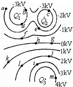 点电荷Q1、Q2和Q3所产生的静电场的等势面与纸面的交线如图中的实线所示,图中标在等势面上的数值分别表示该等势面的电势,a、b、c…表示等势面上的点,下列说法中正确的是( )