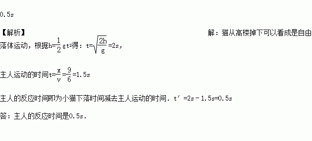 如图所示,有一只小猫从楼高20m处跌下做自由落体运动,他的主人在距跌落点9m处看着小猫跌下,主人跑至跌落点刚好接住小猫,设跑动是匀速的,速度为6m/s,求主人的反应时间(重力加速度g取10m/s2).