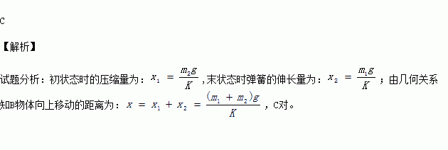 如图所示,轻质弹簧连接A.B两物体,弹簧劲度系数为K,A.B质量分别为m1、m2;A放在水平地面上,B也静止;现用力拉B,使其向上移动,直到A刚好离开地面,此过程中,B物体向上移动的距离为:( )