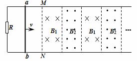 平面上,两导轨左端接有R=2Ω的电阻,导轨所在区域内加上与导轨垂直、方向相反的磁场,磁场宽度d相同且为0.6m,磁感应强度大小B1=