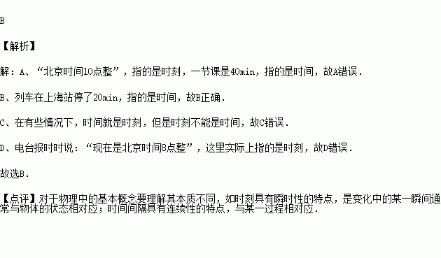 A.“北京时间10点整”,指的是时间,一节课是40min,指的是时刻