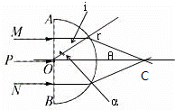 【分析】: 光束垂直于AB从空气射入玻璃砖,方向不变进入玻璃砖,射到玻璃砖右侧圆弧面时,发生折射,由几何知识求出入射角i,根据折射定律求出折射角r,再由几何知识求解M、N射出玻璃砖后的相交点距O点的距离.