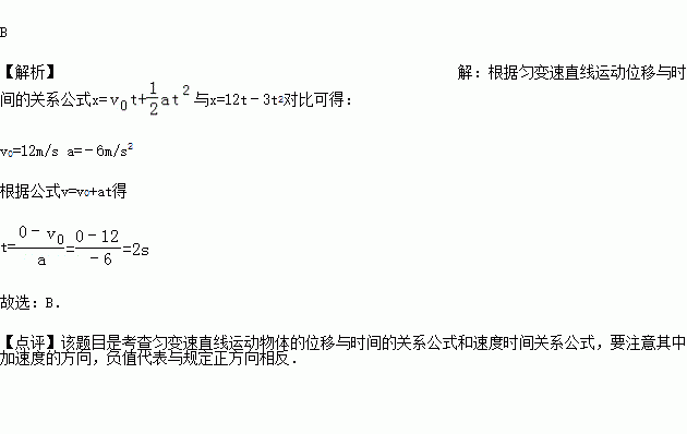 一物体在水平面上做匀变速直线运动,其位移与时间的关系为x=12t﹣3t2,则它的速度等于零的时刻t为( )