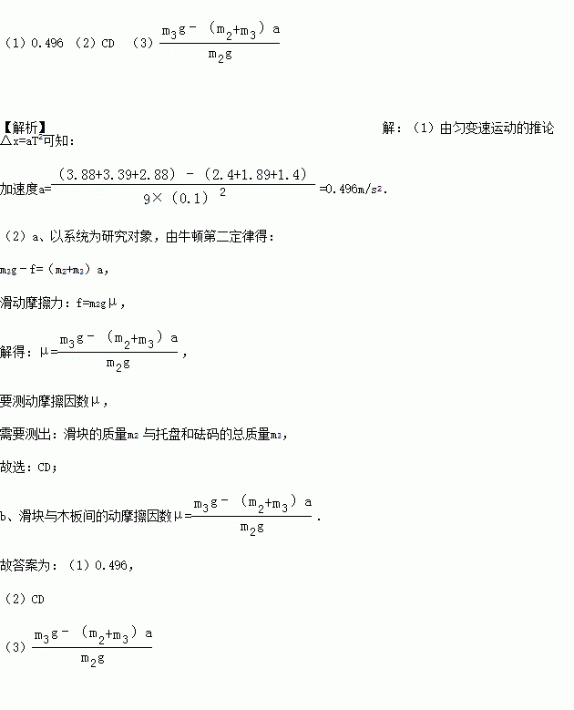某物理小组在一次探究活动中测量滑块与木板之间的动摩擦因数.实验装置如图1,一表面粗糙的木板固定在水平桌面上,一端装有定滑轮;木板上有一滑块,其一端与电磁打点计时器的纸带相连,另一端通过跨过定滑轮的细线与托盘连接.打点计时器使用的交流电源的频率为50Hz.开始实验时,在托盘中放入适量砝码,滑块开始做匀加速运动,在纸带上打出一系列小点.