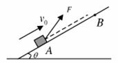 如图所示,一质量m=0.4kg的小物块,以V0=2m/s的初速度,在与斜面成某一夹角的拉力F作用下,沿斜面向上做匀加速运动,经t=2s的时间物块由A点运动到B点,A、B之间的距离L=10m。已知斜面倾角θ=30o,物块与斜面之间的动摩擦因数![]()