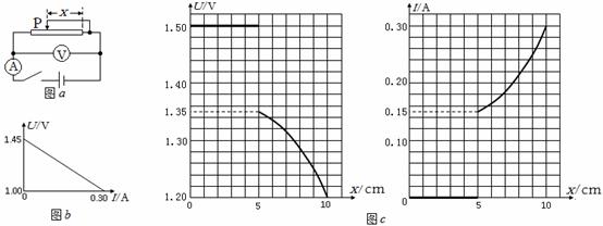 (2)第二组同学也利用图a的连接测量另一节干电池,初始时滑片P在最右端,但由于滑动变阻器某处发生断路,合上电键后发现滑片P向左滑过一段距离x后电流表有读数,于是该组同学分别作出了电压表读数U与x、电流表读数I与x的关系图,如图c所示,则根据图像可知,电池的电动势为 V,内阻为 W。