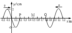 两列简谐横波分别沿x轴正方向和负方向传播,波速均为υ=0.4m/s,波源的振幅均为A=2cm。如图所示为t=0时刻两列波的图象,此刻平衡位置在x=0.2m和x=0.8m的P、Q两质点恰好开始振动。质点M的平衡位置位于x=0.5m处。求: