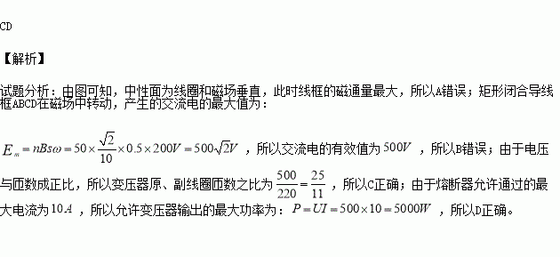 T的水平匀强磁场中,线框面积S=0.5m2,线框电阻不计。线框绕垂直于磁场的轴OO′以角速度ω=200 rad/s匀速转动,并与理想变压器原线圈相连,副线圈接入一只 “220V,60W”灯泡,且灯泡正常发光,熔断器允许通过的最大电流为10A,下列说法正确的是