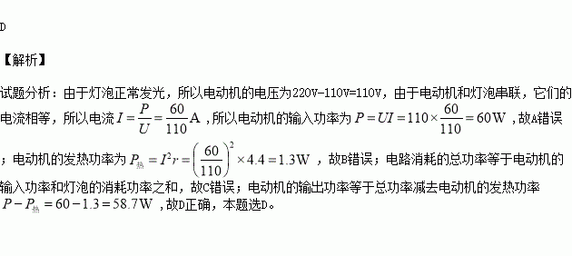 有一直流电动机的内阻为4.4Ω和一盏标有“110V, 60W”的灯泡串联后接在电压为220V的电路两端,灯泡正常发光,则( )