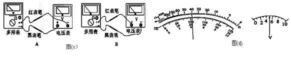 (3)某同学想通过一个多用电表中的欧姆挡,直接去测量某电压表(量程10 V)的内阻(大约为几十千欧),欧姆挡的选择开关拨至倍率×1K挡.先将红、黑表笔短接调零后,选用图(c)中________(填“A”或“B”)方式连接。在本实验中,如图(d)所示为欧姆表和电压表的读数,请你利用所学过的知识,求出欧姆表电池的电动势为________V。(计算结果保留三位有效数字)
