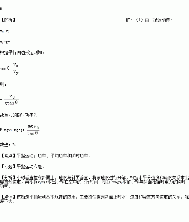 如图所示,质量为m的小球以初速度v0水平抛出,恰好垂直打在倾角为θ的斜面上,(不计空气阻力)则球落在斜面上时重力的瞬时功率为( )