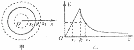 如图甲,真空中有一半径为R、电荷量为+Q的均匀带电球体,以球心为坐标原点,沿半径方向建立x轴.理论分析表明,x轴上各点的场强随x变化关系如图乙,已知x1与R两点间距大于R与x2的两点间距,则( )