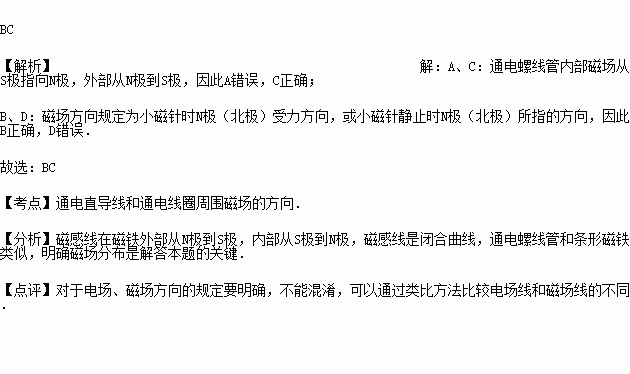 在通电螺线管内部有一点A,通过A点的磁感线方向一定是( )