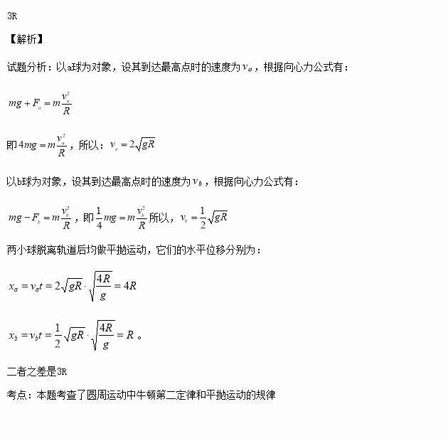 如图所示,半径为R,内径很小的光滑半圆管竖直放置。两个质量均为m的小球a、b以不同的速度进入管内,a通过最高点A时,对管壁上部的压力为3mg,b通过最高点A时,对管壁下部的压力为0.75 mg,求a、b两球落地点间的距离。