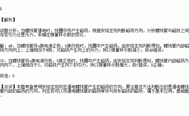D.若将b接电源正极,a接电源负极,弹簧测力计示数将增大