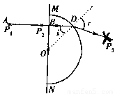(8分)某研究性学习小组利用插针法可以测量半圆形玻璃砖的折射率。实验探究方案如下:在白纸上做一直线MN,并做出它的一条垂线AB,将半圆柱形玻璃砖(底面的圆心为O)放在白纸上,它的直边与直线MN对齐,在垂线AB上插两个大头针P1和P2,然后在半圆柱形玻璃砖的右侧插上适量的大头针,可以确定光线P1P2通过玻璃砖后的光路,从而求出玻璃的折射率.实验中提供的器材除了半圆柱形玻璃砖、木板和大头针外,还有量角器等。
