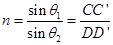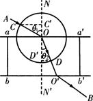 中求玻璃的折射率.本实验存在两个缺点:第一,麻烦;第二,易产生较大误差.下面介绍一种改进方法:找到入射光线和折射光线以后,以入射点O为圆心,以任意长为半径画圆,分别与AO、OO'(或OO'的延长线)交于C点和D点,过C、D两点分别向法线NN'作垂线,交NN'于C'、D'点,用直尺量出CC'和DD'的长,如图所示.