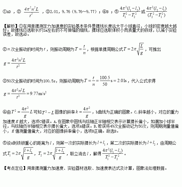 ⑤某同学在家里测重力加速度。他找到细线和铁锁,制成一个单摆,如图所示,由于家里只有一根量程为30cm的刻度尺,于是他在细线上的A点做了一个标记,使得悬点O到A点间的细线长度小于刻度尺量程。保持该标记以下的细线长度不变,通过改变O、A间细线长度以改变摆长。实验中,当O、A间细线的长度分别为