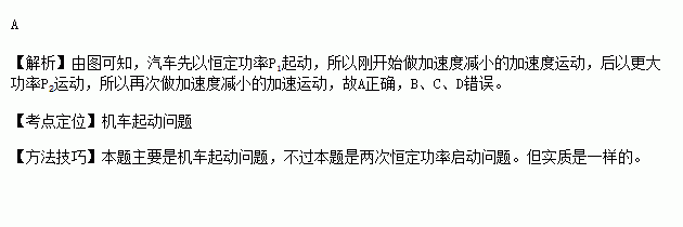 一汽车在平直公路上行驶。从某时刻开始计时,发动机的功率P随时间t的变化如图所示。假定汽车所受阻力的大小f恒定不变。下列描述该汽车的速度v随时间t变化的图像中,可能正确的是