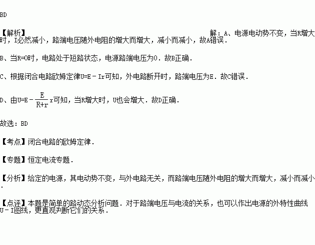 C.当电路断开时,I=0,U=0 D.当R增大时,U也会增大