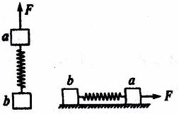 如图所示,a、b两物体的质量分别为m1和m2,由轻质弹簧相连。当用恒力F竖直向上拉着a ,使a、b—起向上做匀加速直线运动时,弹簧伸长量为为x1,加速度大小为a1;当用大小仍为F的恒力沿水平方向拉着a,使a、b—起沿光滑水平桌面做匀加速直线运动时,弹簧伸长量为x2,加速度大小为a2。则有()
