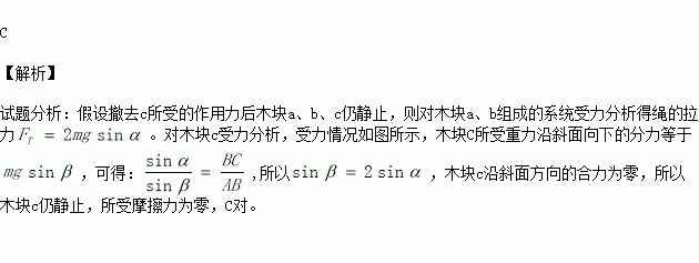 斜面ABC固定在水平面上,AB面光滑,BC面粗糙,AB长度是BC长度的两倍。三个相同木块a、b、c通过轻质光滑定滑轮用细线相连,细线平行于斜面,如图所示。用手按住c,使其静止在BC上;现撤去c所受手的作用力,则下列关于木块c的判断,正确的是()