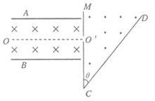 如图所示,两平行金属板AB中间有互相垂直的匀强电场和匀强磁场。A板带正电荷,B板带等量负电荷,电场强度为E;磁场方向垂直纸面向里,磁感应强度为B1。平行金属板右侧有一挡板M,中间有小孔O′,OO′是平行于两金属板的中心线。挡板右侧有垂直纸面向外的匀强磁场,磁场应强度为B2。CD为磁场B2边界上的一绝缘板,它与M板的夹角θ=45°,O′C=a,现有大量质量均为m,含有各种不同电荷量、不同速度的带电粒子(不计重力),自O点沿OO′方向进入电磁场区域,其中有些粒子沿直线OO′方向运动,并进入匀强磁场B2中,求: