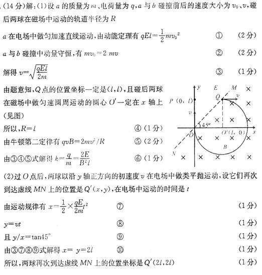 如图所示,xOy是位于足够大的绝缘光滑水平桌面内的平面直角坐标系,虚线MN是∠xOy的角平分线。在MN的左侧区域,存在着沿x轴负方向、场强为E的匀强电场;在MN的右侧区域,存在着方向竖直向下,磁感应强度为B的匀强磁场。现有一带负电的小球a从y轴上的P(0,l)点,在电场力作用下由静止开始运动,a球到达虚线MN上的Q点时与另一个不带电的静止小球b发生碰撞,碰后两小球粘合在一起进入磁场,它们穿出磁场的位置恰好在O点。若a、b两小球的质量相等且均可视为质点,a、b碰撞过程中无电荷量损失。求: